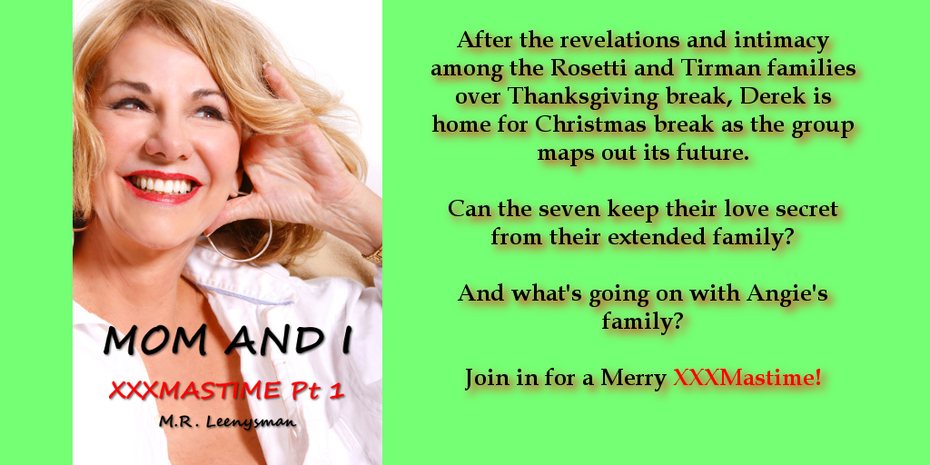 Continuing the Mom and I series. Derek began Thanksgiving break with a girlfriend Angie, a look-alike for his mom, Marcy. He ended it engaged to Angie, but also sexually involved with his mother, newly-identified half-sister Jessica and Jessica’s mother Jilly, along with his father Stan and half-brother Tommy, who became engaged to Jessica on the same day. Now, Derek and Tommy are back home for Christmas and the twists and turns for the seven of them continue. Where will the holiday season take them now?